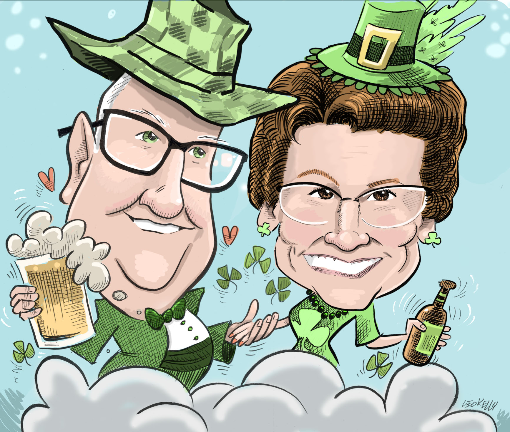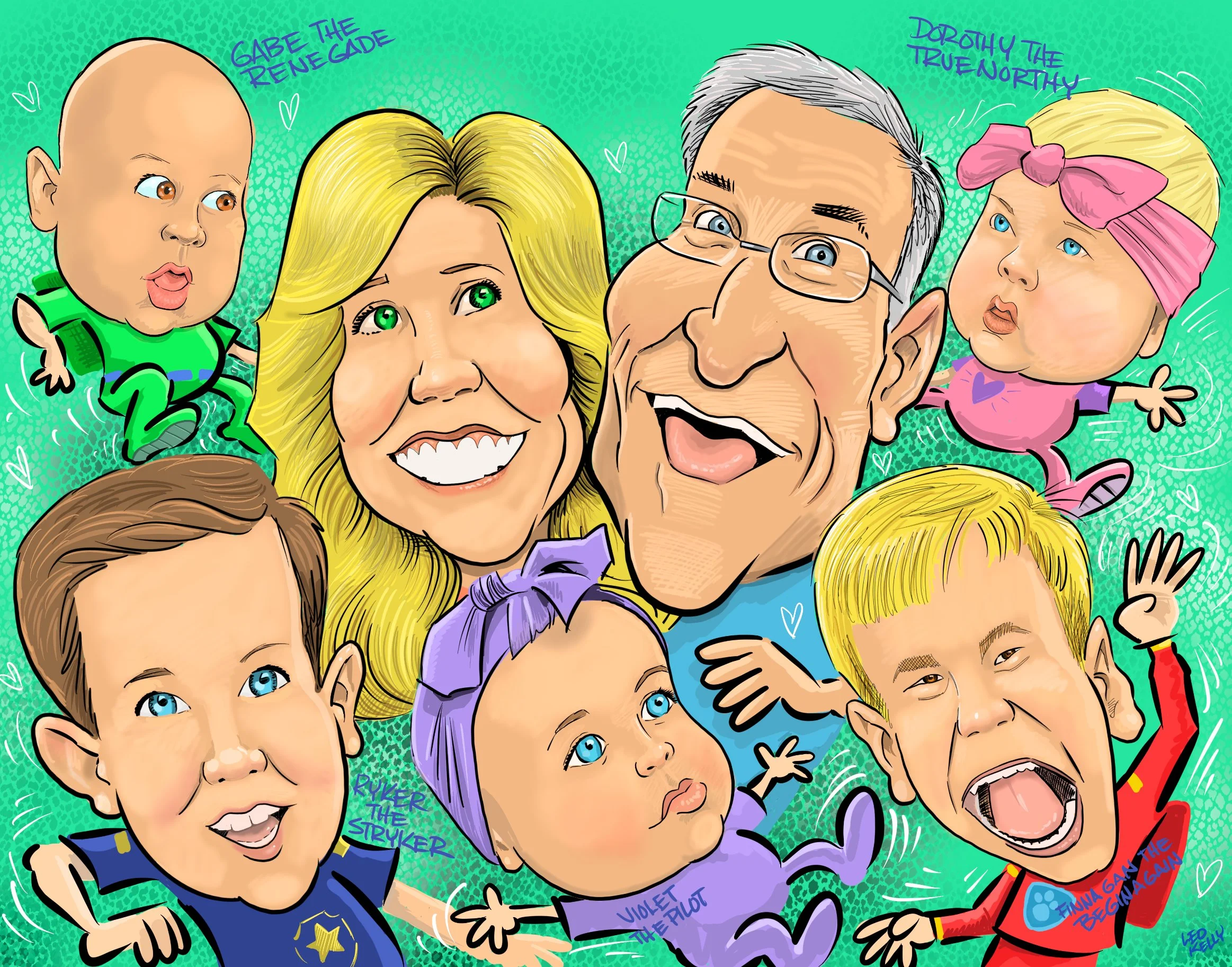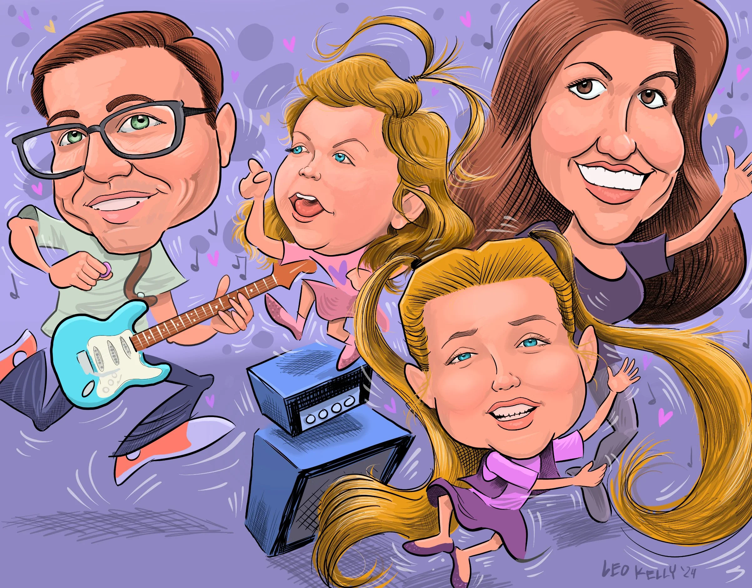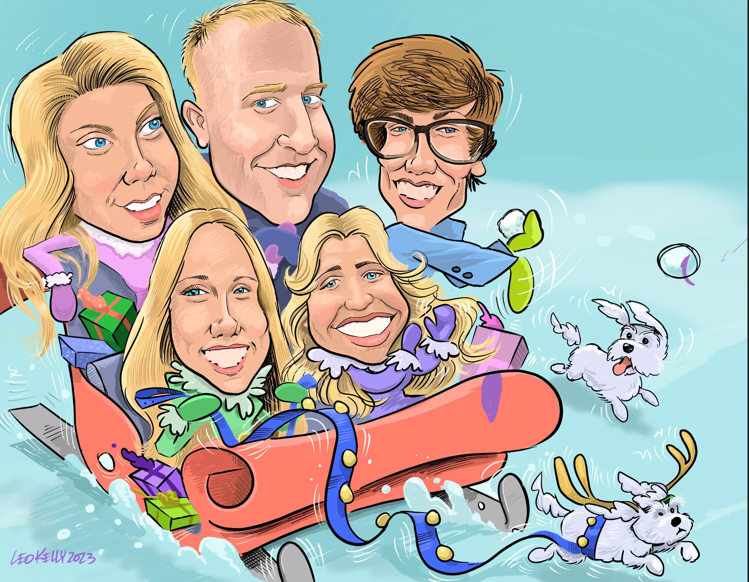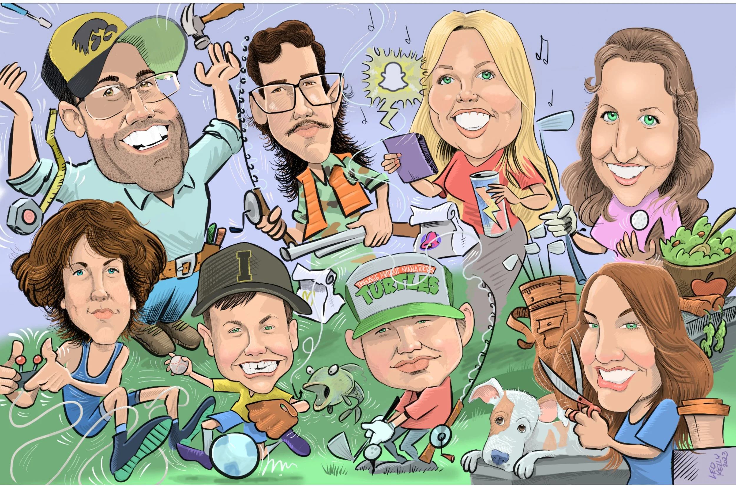 Leo Kelly draws families, teams, work groups,dogs, cats….caricatures make a great